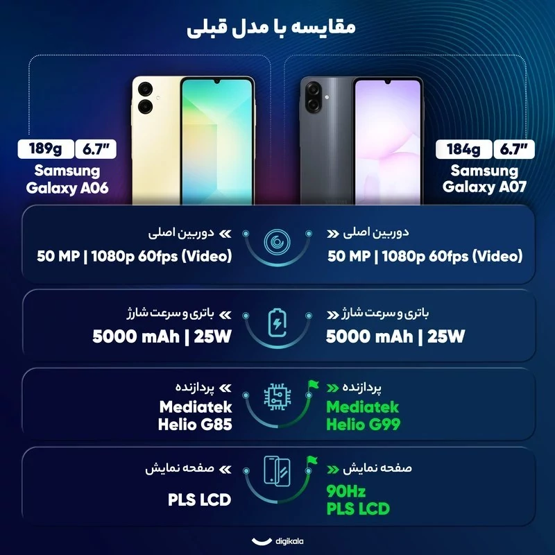 گوشی سامسونگ Galaxy A07 بازیگر جدید سامسونگ در بازار گوشیهای اقتصادی است که تلاش میکند امکانات زیادی را در بازه قیمتی پایین ارائه دهد. این گوشی به پردازنده مدیاتک Helio G99 مجهز است و تجربهای روان در اجرای برنامههای روزمره و بازيهای سبک فراهم میکند. صفحه نمایش 6.7 اینچی از نوع LCD با وضوح HD+ و نرخ نوسازی 90 هرتز تعادل خوبی میان وضوح تصویر و مصرف انرژی ارائه میدهد و در عین حال حرکت بین منوها و صفحات مختلف را نرمتر جلوه میدهد. در بخش دوربین، Galaxy A07 یک ترکیب دوگانه ارائه میدهد. دوربین اصلی 50 مگاپیکسلی با دیافراگم f/1.8 توانایی ثبت تصاویر واضح در شرایط نوری مناسب را دارد و دوربین دوم 2 مگاپیکسلی نیز از نوع عمقسنج است. برای دوربین سلفی در این مدل، سامسونگ از یک سنسور 8 مگاپیکسلی استفاده کرده است. باتری بزرگ 5000 میلی آمپر ساعتی این دستگاه نشان دهنده دوام بالای باتری در استفاده روزانه است و با پشتیبانی از شارژ سریع 25 واتی، زمان مورد نیاز برای شارژ دستگاه را کاهش میدهد. برای بدنه، سامسونگ از ترکیبی سبک و در عین حال مقاوم استفاده کرده است. پوشش پشتی از پلیمر تقویت شده با فیبر شیشه ساخته شده و از استاندارد IP54 نیز پشتیبانی میکند تا گوشی تا حدودی در برابر پاشش آب و گردوغبار مقاوم باشد. این گوشی با سیستم عامل اندروید 15 و با رابط کاربری One UI 7 عرضه شده است و سامسونگ وعده ارتقاء نرم افزاری و امنیتی را برای شش سال داده است. به طور کلی، Galaxy A07 به عنوان گزینهای مقرون به صرفه برای کسانی به شمار میرود که به دنبال تجربهای روان با امکانات مناسباند.