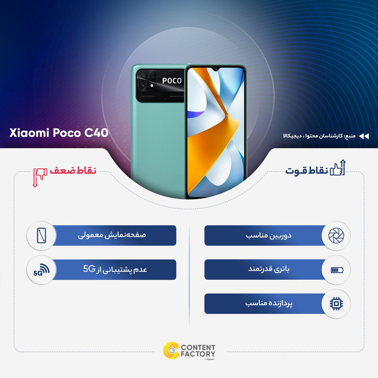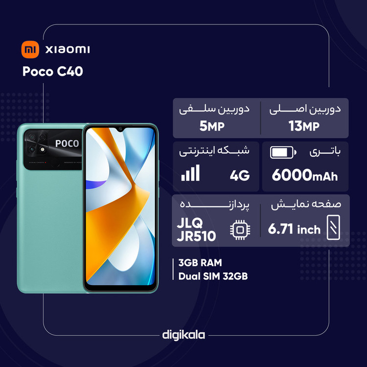 در بین گوشیهای هوشمند میانرده سری Poco شیائومی تا به امروز شاهد رونمایی محصولات باکیفیتی بودیم که شیائومی Poco C40 یکی از این گوشیهای میانرده باکیفیت است. در نمای روبهرویی این گوشی به صفحهنمایش با ابعاد 6.71 اینچ و رزولوشن 720×1650 پیکسل از نوع IPS مجهز شده است. نمایش 268 پیکسل در هر اینچ و حداکثر روشنایی 400 نیت (شمع در متر مربع)، از دیگر قابلیتهای این صفحهنمایش است. طراحی ناچ واتردراپ با بریدگی قطرهای شکل ناچ در قسمت بالایی و مرکزی صفحهنمایش، سنسور دوربین سلفی با رزولوشن 5 مگاپیکسل را در خود جای داده است. در قسمت پشتی هم یک سنسور دوربین اصلی با رزولوشن 13 مگاپیکسل از نوع عریض (wide) در کنار سنسور 2 مگاپیکسل سنجش عمق، سنسورهای دوربین دوگانه شیائومی Poco C40 را تشکیل میدهند. قابلیت ضبط ویدیو با حداکثر کیفیت 1080p و سرعت 30 فریم در ثانیه هم از دیگر قابلیتهای سنسور دوربین اصلی این گوشی است. در بخش مشخصات سختافزاری هم این گوشی به پردازنده JLQ JR510 مجهز شده که توانایی ارائه عملکرد قابل قبولی در حد و اندازه یک گوشی میانرده در اجرای بازیهای محبوب و نرمافزارهای کاربردی دارد. اما بدون شک یکی از قدرتمندترین مشخصات در نظر گرفته شده برای این گوشی هوشمند، باتری با میزان ظرفیت 6000 میلیآمپرساعتی است که کمتر گوشی در این بازه قیمتی از چنین باتری قدرتمندی بهره برده است. باتری که به ازای هر بار شارژ صد درصدی، به راحتی در مصرف عادی طول عمر مفید (زمان آماده بهکار) دو روز را ارائه میکند. پشتیبانی از فناوری شارژ سریع با توان 18 وات هم از دیگر قابلیتهای در نظر گرفته شده است.